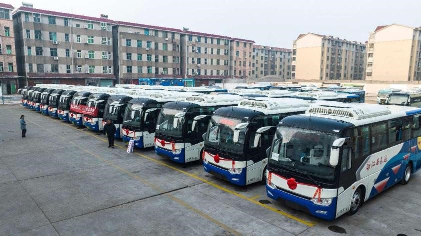 Twenty-four newly purchased new energy buses are parked in a bus station in Ji'an, east China's Jiangxi province, Jan. 6, 2025. (People's Daily Online/Li Fusun)