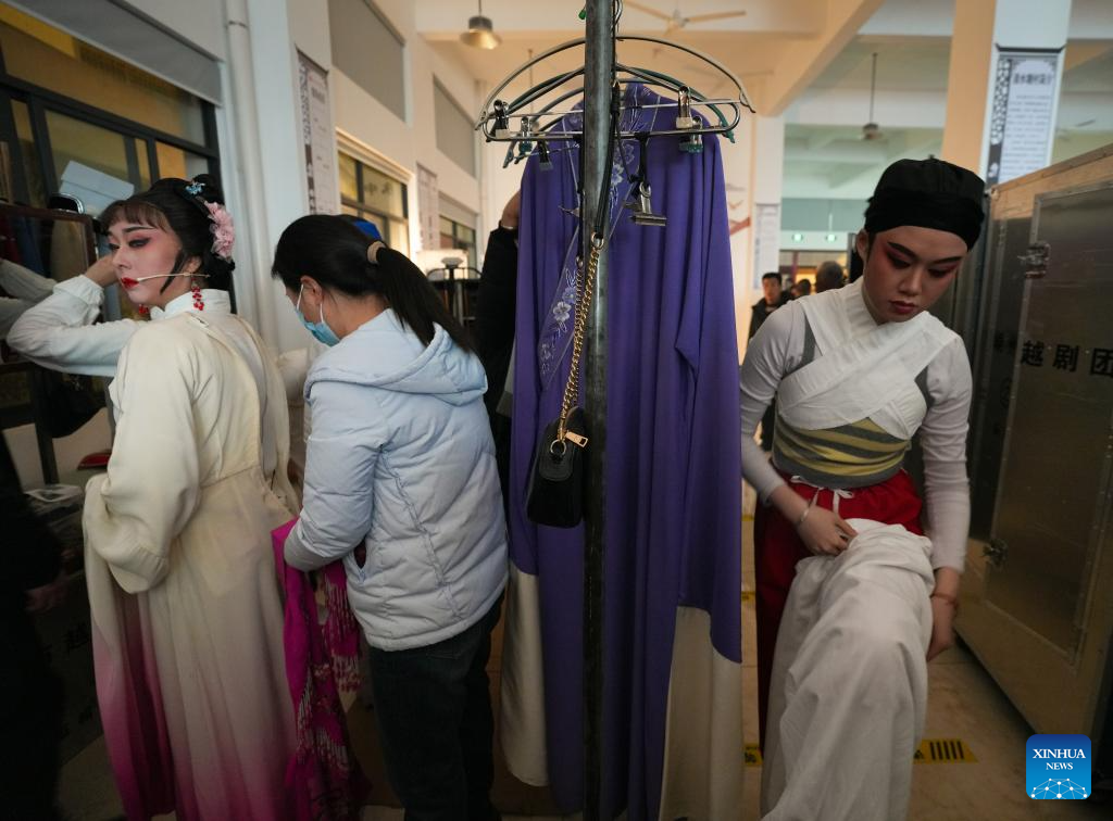 Artists prepare to perform Shaoxing Opera during an opera gala in Qiaoli Village of Shengzhou, east China's Zhejiang Province, Jan. 21, 2025. Shaoxing opera, also known as Yue opera, emerged in the early 1900s in east China's Zhejiang Province. Around the Spring Festival, opera troupes are busy performing at theaters, cultural halls, and temple fairs, creating a vibrant and festive atmosphere.