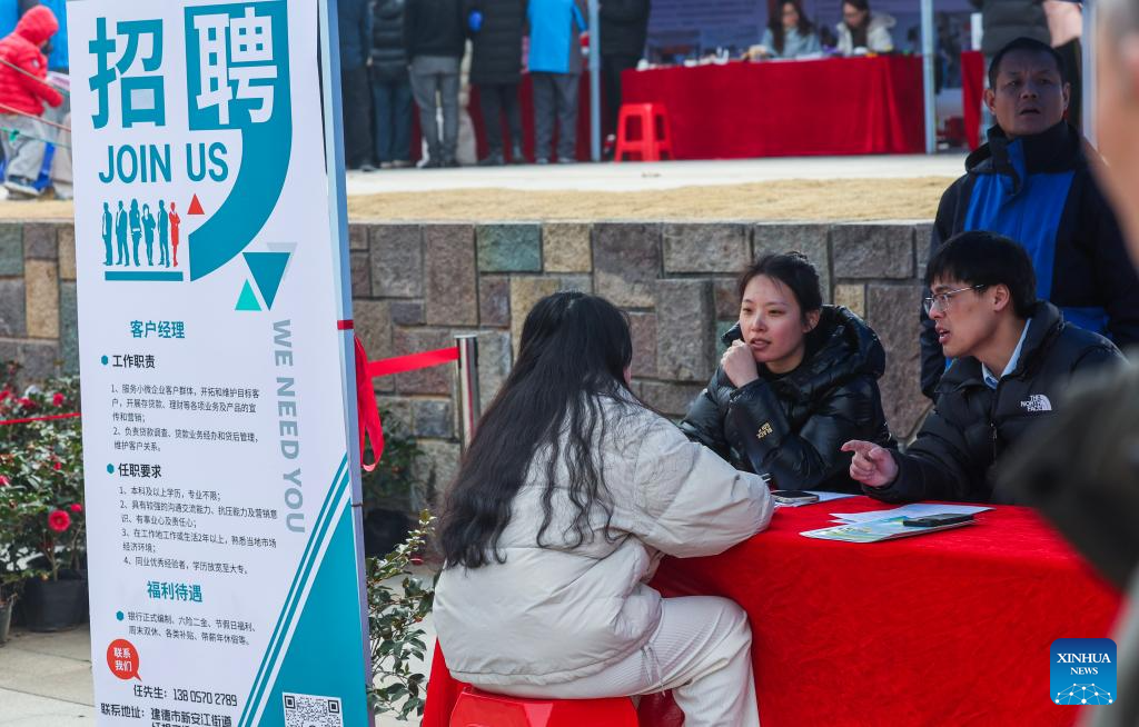 A jobseeker talks to recruiters at a job fair held in Jiande City, east China's Zhejiang Province, Feb. 6, 2025. A job fair was held here on Thursday. Over 120 enterprises from a variety of industries such as new energy, new materials, intelligent manufacturing and biomedicine participated in the job fair, providing more than 3,000 jobs. (Xinhua/Xu Yu)
