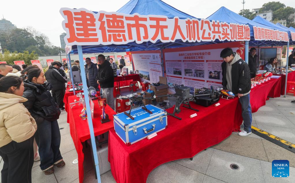 Staff members of a training base offer drone training at a job fair held in Jiande City, east China's Zhejiang Province, Feb. 6, 2025. A job fair was held here on Thursday. Over 120 enterprises from a variety of industries such as new energy, new materials, intelligent manufacturing and biomedicine participated in the job fair, providing more than 3,000 jobs. (Xinhua/Xu Yu)