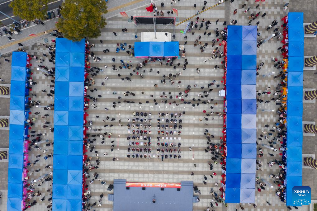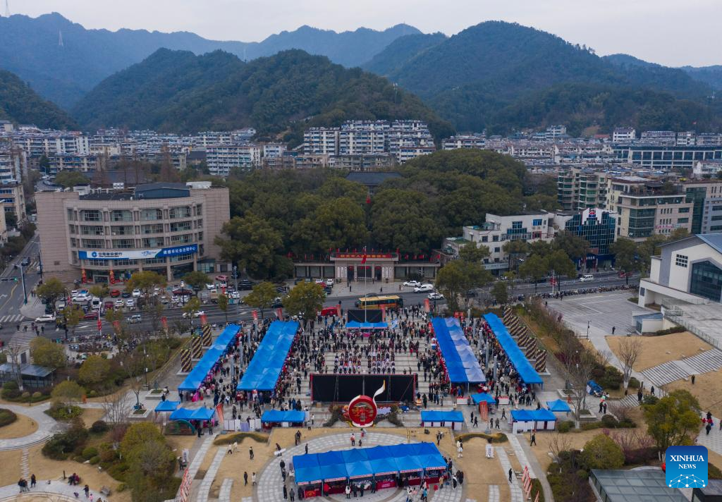 An aerial drone photo taken on Feb. 6, 2025 shows a job fair held in Jiande City, east China's Zhejiang Province. A job fair was held here on Thursday. Over 120 enterprises from a variety of industries such as new energy, new materials, intelligent manufacturing and biomedicine participated in the job fair, providing more than 3,000 jobs. (Xinhua/Xu Yu)