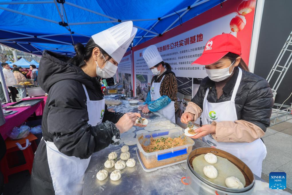 Staff members of a training base demonstrate the production of a local food made with tofu at a job fair held in Jiande City, east China's Zhejiang Province, Feb. 6, 2025. A job fair was held here on Thursday. Over 120 enterprises from a variety of industries such as new energy, new materials, intelligent manufacturing and biomedicine participated in the job fair, providing more than 3,000 jobs. (Xinhua/Xu Yu)
