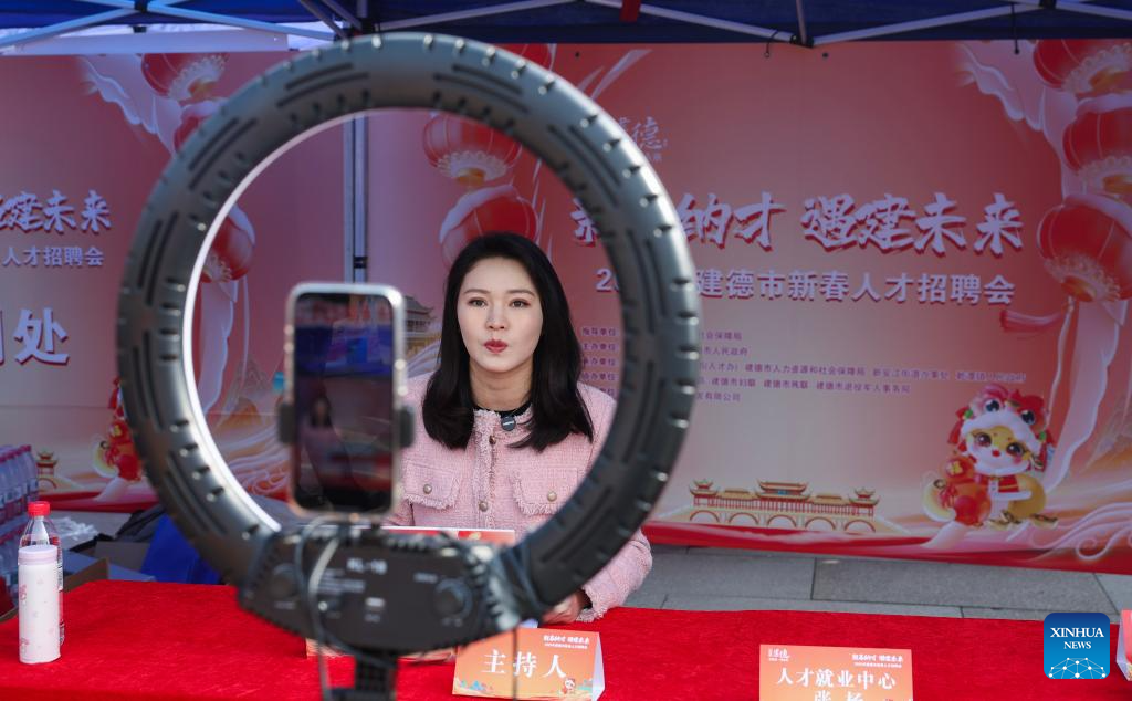 A livestreamer introduces job recruitment requirements of companies in a livestreaming session at a job fair held in Jiande City, east China's Zhejiang Province, Feb. 6, 2025. A job fair was held here on Thursday. Over 120 enterprises from a variety of industries such as new energy, new materials, intelligent manufacturing and biomedicine participated in the job fair, providing more than 3,000 jobs. (Xinhua/Xu Yu)