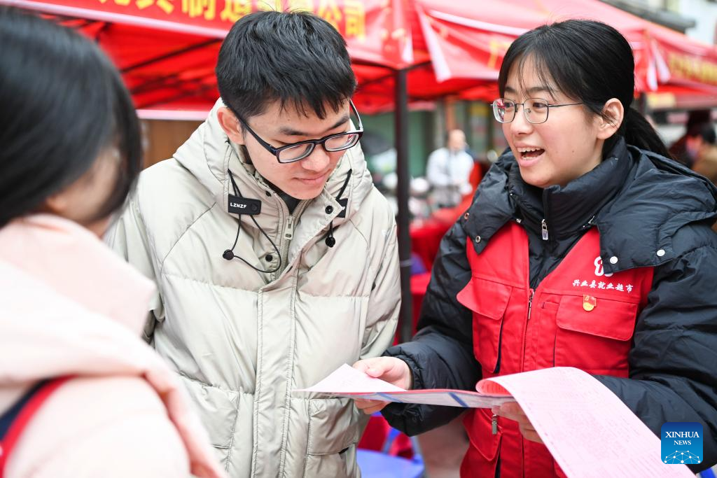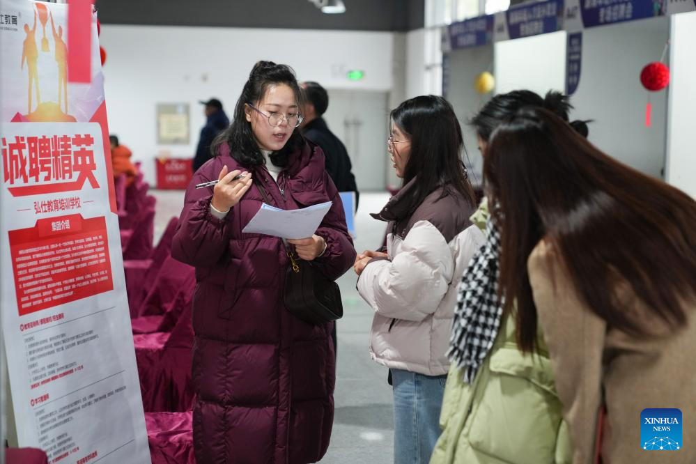 Job seekers attend a job fair in Xinghua City, east China's Jiangsu Province, Feb. 7, 2025. As the Spring Festival holiday ended, a variety of job fairs are held across the country. (Photo by Zhou Shegen/Xinhua)