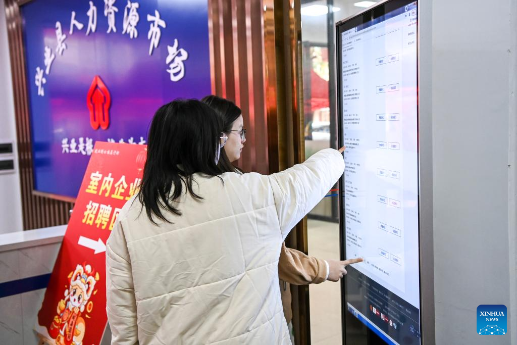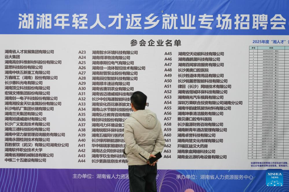 A job seeker looks at a list of the enterprises participating in a job fair held in Changsha, central China's Hunan Province, Feb. 7, 2025. As the Spring Festival holiday ended, a variety of job fairs are held across the country. (Xinhua/Chen Zeguo)