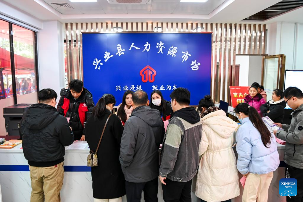 Job seekers talk with recruiters at a job fair in Yulin, south China's Guangxi Zhuang Autonomous Region, Feb. 7, 2025. As the Spring Festival holiday ended, a variety of job fairs are held across the country. (Xinhua/Cao Yiming)