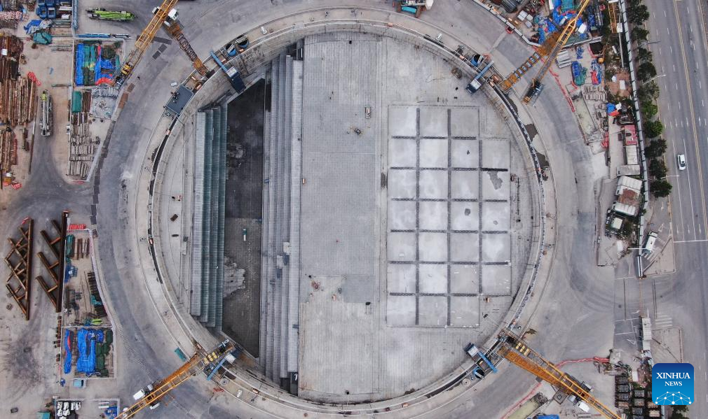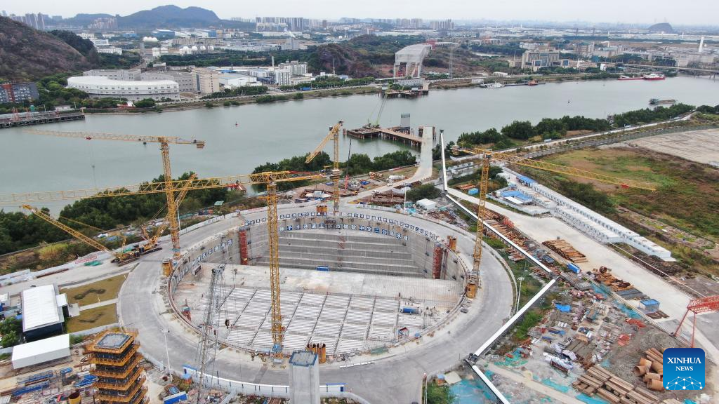 An aerial drone photo taken on Feb. 7, 2025 shows the construction site of the west anchorage of the Shiziyang grand bridge, a major project of the Shiziyang Channel in south China's Guangdong Province. The Shiziyang Channel is another mega infrastructure project after the Hong Kong-Zhuhai-Macao Bridge and the Shenzhen-Zhongshan Link in south China's Guangdong-Hong Kong-Macao Greater Bay Area. Its major project, the Shiziyang grand bridge, has a main span of 2,180 meters. Upon completion, it will play an important role in the development of the Pearl River Estuary area. (Xinhua/Wang Ruiping)