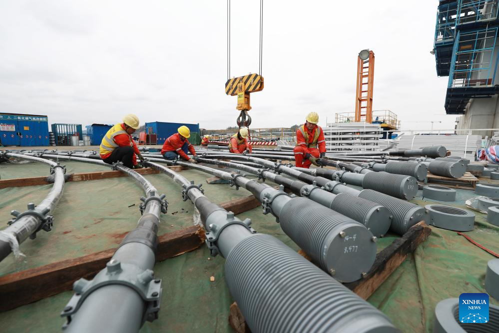 Staff members work at the construction site of the Shiziyang grand bridge, a major project of the Shiziyang Channel in south China's Guangdong Province, Feb. 7, 2025. The Shiziyang Channel is another mega infrastructure project after the Hong Kong-Zhuhai-Macao Bridge and the Shenzhen-Zhongshan Link in south China's Guangdong-Hong Kong-Macao Greater Bay Area. Its major project, the Shiziyang grand bridge, has a main span of 2,180 meters. Upon completion, it will play an important role in the development of the Pearl River Estuary area. (Xinhua/Wang Ruiping)