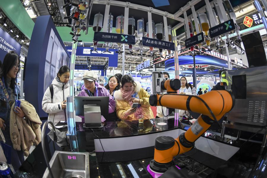 People view an AI-driven bartending system at the booth of Siemens in the Advanced Manufacturing Chain exhibition area of the second China International Supply Chain Expo in Beijing, capital of China, Nov. 27, 2024. (Xinhua/Zhang Haofu)
