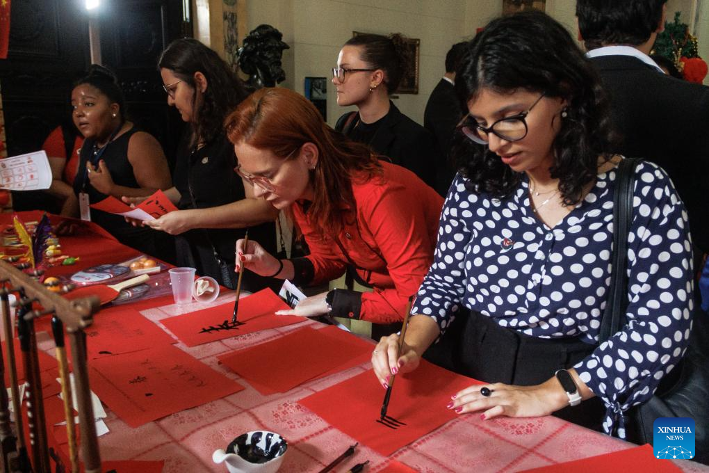 People try Chinese calligraphy during an event celebrating the Spring Festival in Tiradentes Palace in Rio de Janeiro, Brazil, Feb. 6, 2025. (Photo by Claudia Martini/Xinhua)