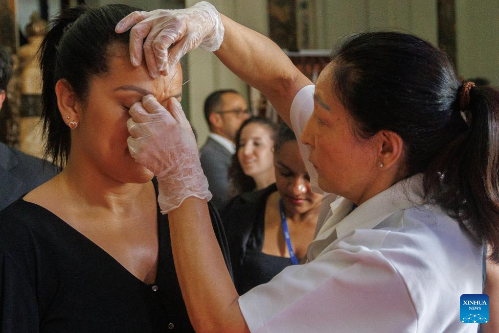 A local woman (L) tries acupuncture during an event celebrating the Spring Festival in Tiradentes Palace in Rio de Janeiro, Brazil, Feb. 6, 2025. (Photo by Claudia Martini/Xinhua)
