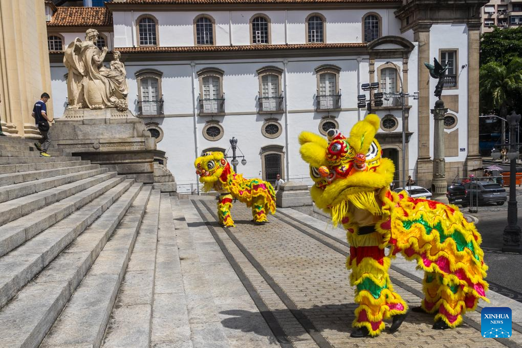 Lion dancers perform during an event celebrating the Spring Festival in front of Tiradentes Palace in Rio de Janeiro, Brazil, Feb. 6, 2025. (Photo by Claudia Martini/Xinhua)