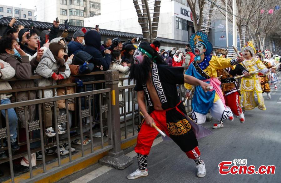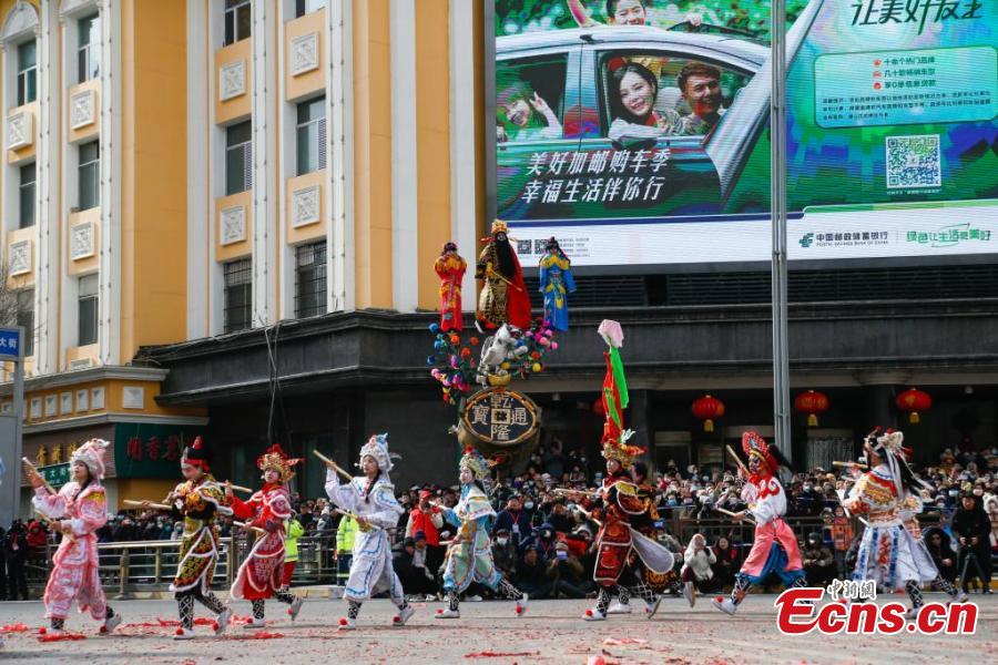 Dancers perform the Chaoshan Yingge dance, or "dance to the hero's song," in Xining, northwest China's Qinghai Province. (China News Service/Ma Mingyan)