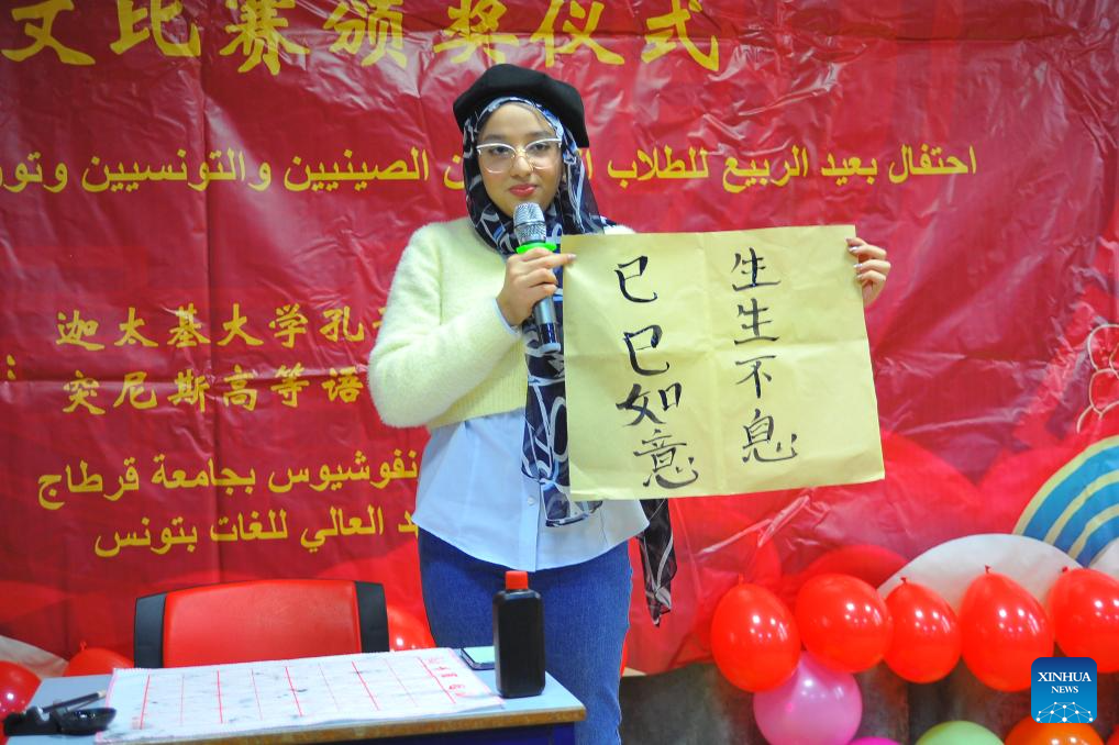 A Tunisian student displays her calligraphic work during a gala celebrating the Spring Festival at Carthage University in Tunis, Tunisia, Feb. 7, 2025. (Photo by Adel Ezzine/Xinhua)