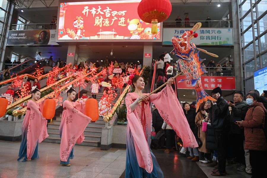 Actresses perform at the Yiwu International Trade Market in Yiwu, east China's Zhejiang Province, Feb. 9, 2025. Merchants at the Yiwu International Trade Market on Sunday welcomed their first business day in the Year of the Snake. (Xinhua/Huang Zongzhi)