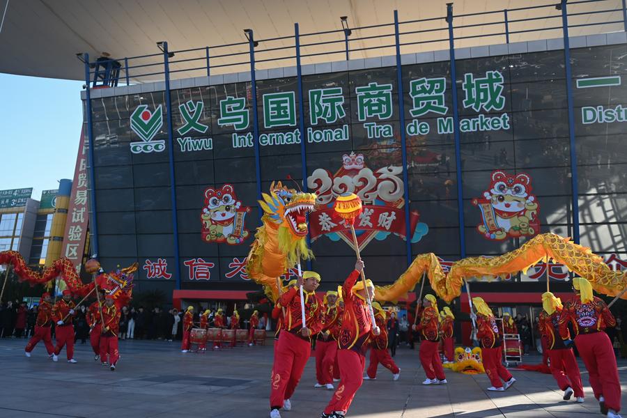 A dragon dance is staged at a square of the Yiwu International Trade Market in Yiwu, east China's Zhejiang Province, Feb. 9, 2025. Merchants at the Yiwu International Trade Market on Sunday welcomed their first business day in the Year of the Snake. (Xinhua/Huang Zongzhi)