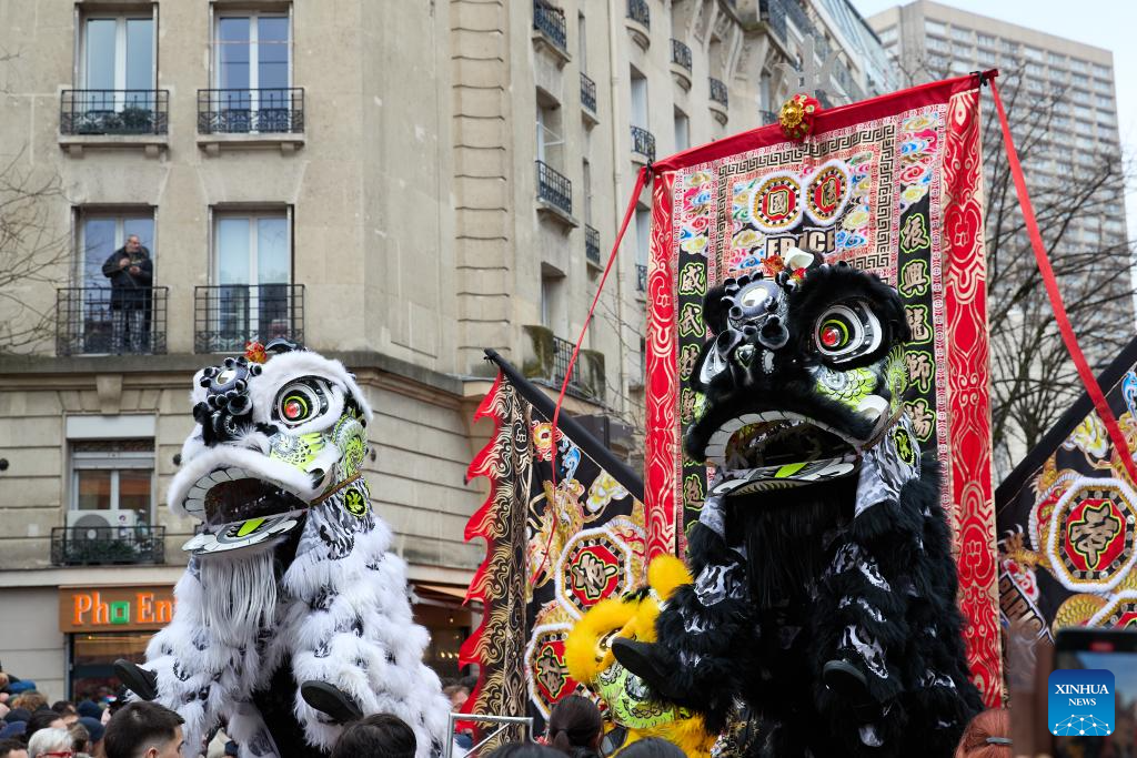 Lion dance performers participate in a Chinese New Year parade in Paris, France, Feb. 9, 2025. (Xinhua/Meng Dingbo)