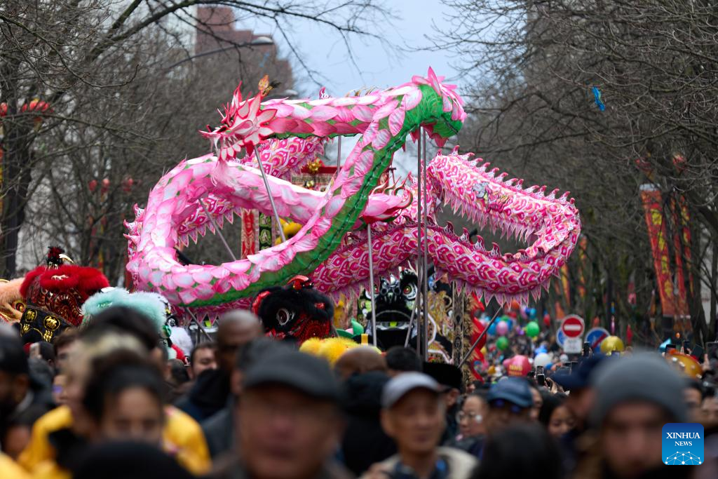 Lion and dragon dance performers participate in a Chinese New Year parade in Paris, France, Feb. 9, 2025. (Xinhua/Meng Dingbo)