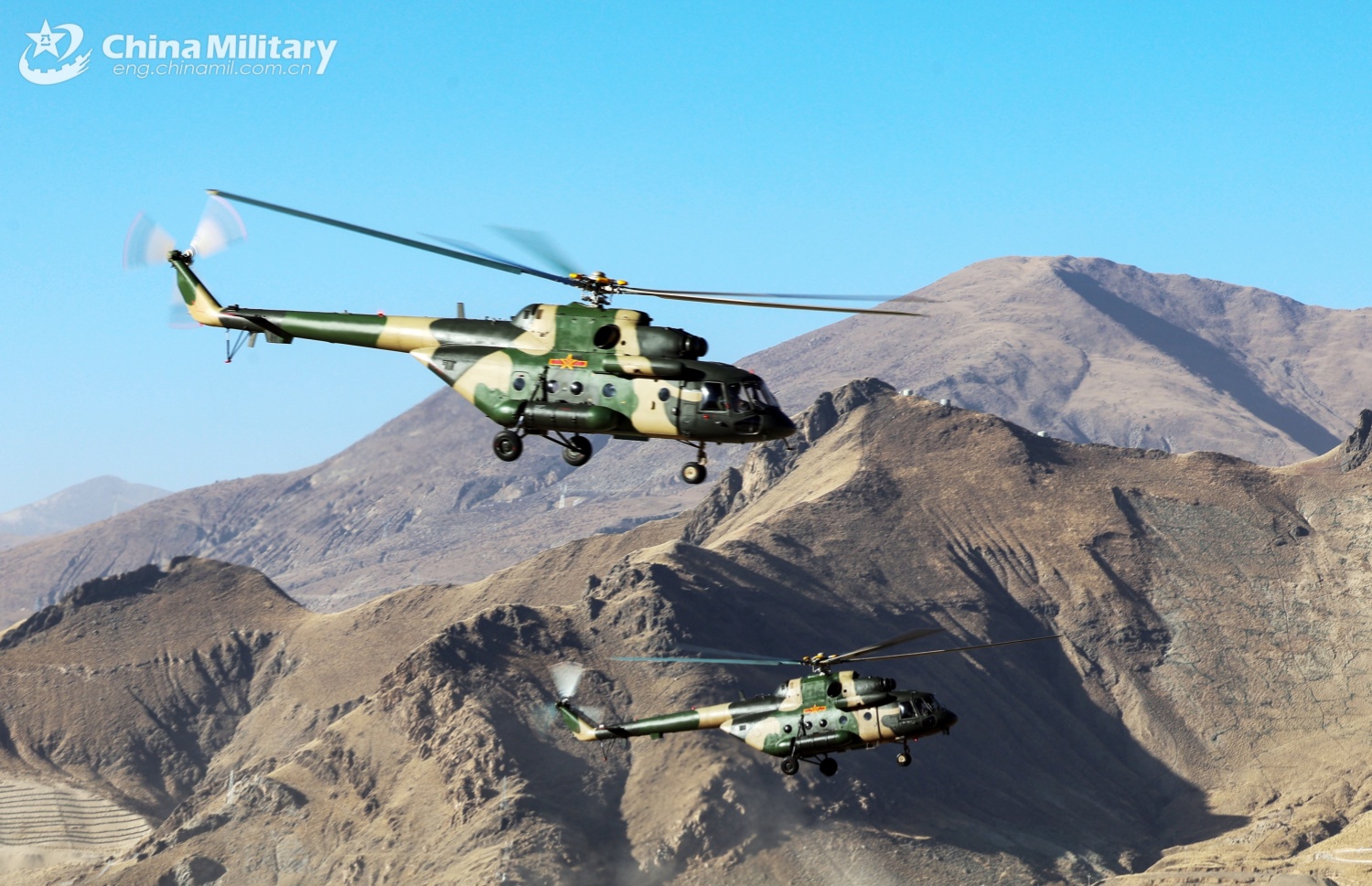 A Z-20 transport helicopter and a Mi-171 transport helicopter attached to an army aviation brigade under the Chinese PLA Xizang Military Command land during a flight training exercise in early January, 2025. (eng.chinamil.com.cn/Photo by Hu Qiwu)