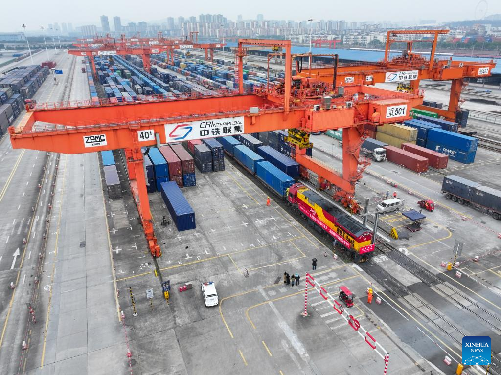 This photo shows a cargo train before departure at the Tuanjiecun Station in Chongqing, southwest China, Feb. 10, 2025. A freight train loaded with 55 forty-foot equivalent unit containers left Chongqing on Monday for Afghanistan's port city of Hairatan, marking the first trip of the direct freight train service between two cities. (Xinhua/Tang Yi)
