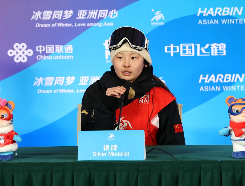 Silver medalist Zhang Xiaonan of China attends the press conference after the women's snowboard big air final match at the 9th Asian Winter Games in Yabuli, northeast China's Heilongjiang Province, Feb. 10, 2025. (Xinhua/Zhang Chenlin)