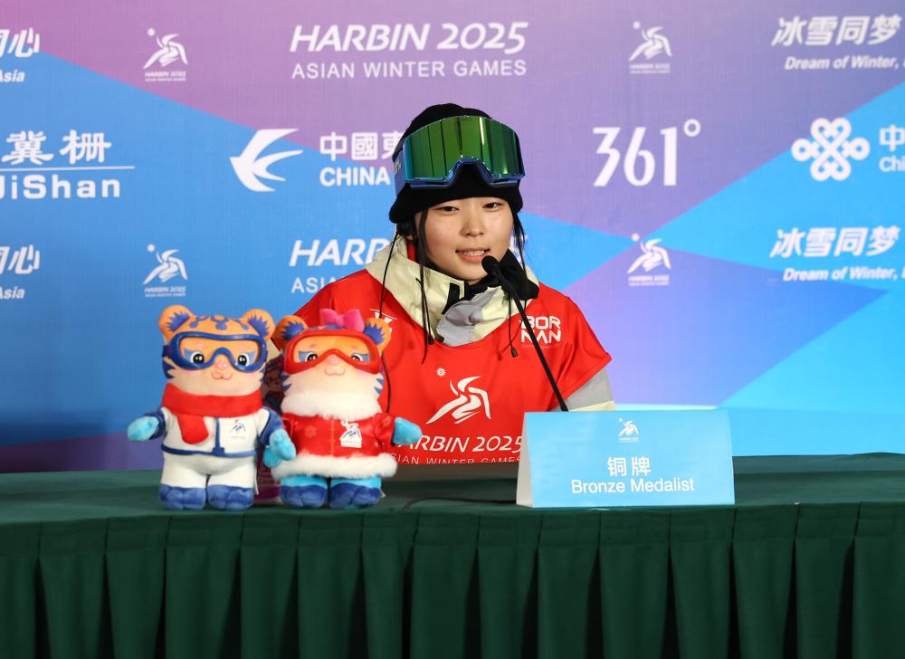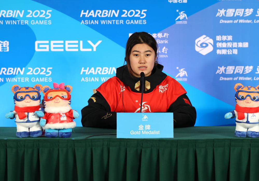 Gold medalist Xiong Shirui of China attends the press conference after the women's snowboard big air final match at the 9th Asian Winter Games in Yabuli, northeast China's Heilongjiang Province, Feb. 10, 2025. (Xinhua/Zhang Chenlin)