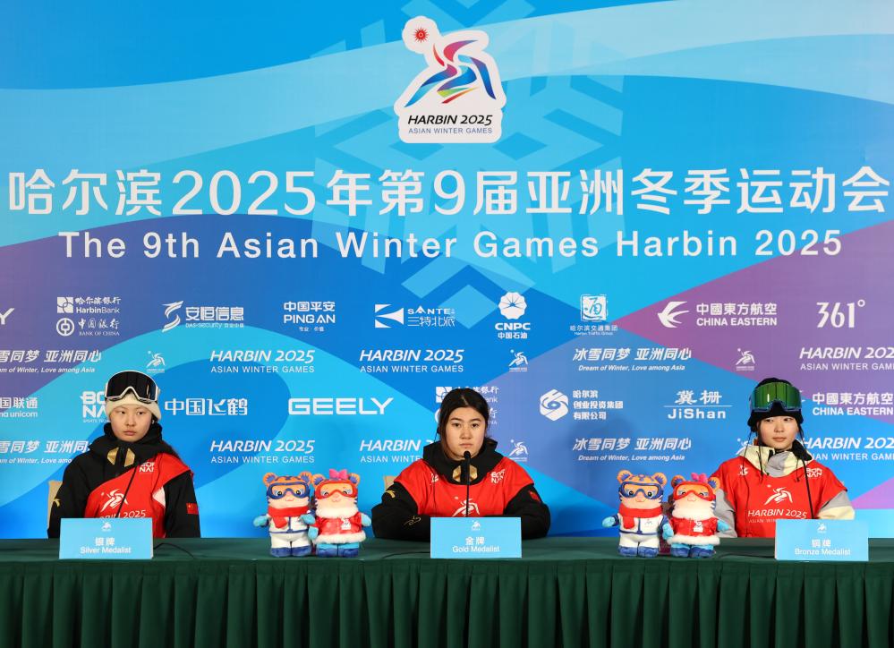 Gold medalist Xiong Shirui (C) of China, silver medalist Zhang Xiaonan (L) of China and bronze medalist Ishimoto Suzuka of Japan attend the press conference after the women's snowboard big air final match at the 9th Asian Winter Games in Yabuli, northeast China's Heilongjiang Province, Feb. 10, 2025. (Xinhua/Zhang Chenlin)
