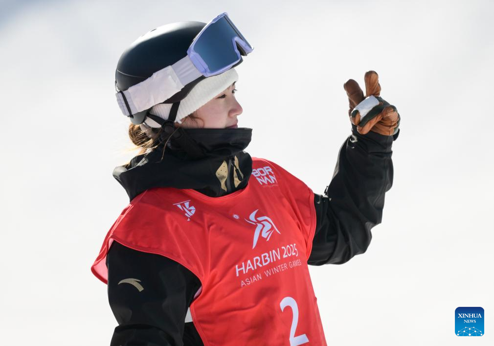 Xiong Shirui of China celebrates after the women's snowboard big air final match at the 9th Asian Winter Games in Yabuli, northeast China's Heilongjiang Province, Feb. 10, 2025. (Xinhua/Yang Guanyu)