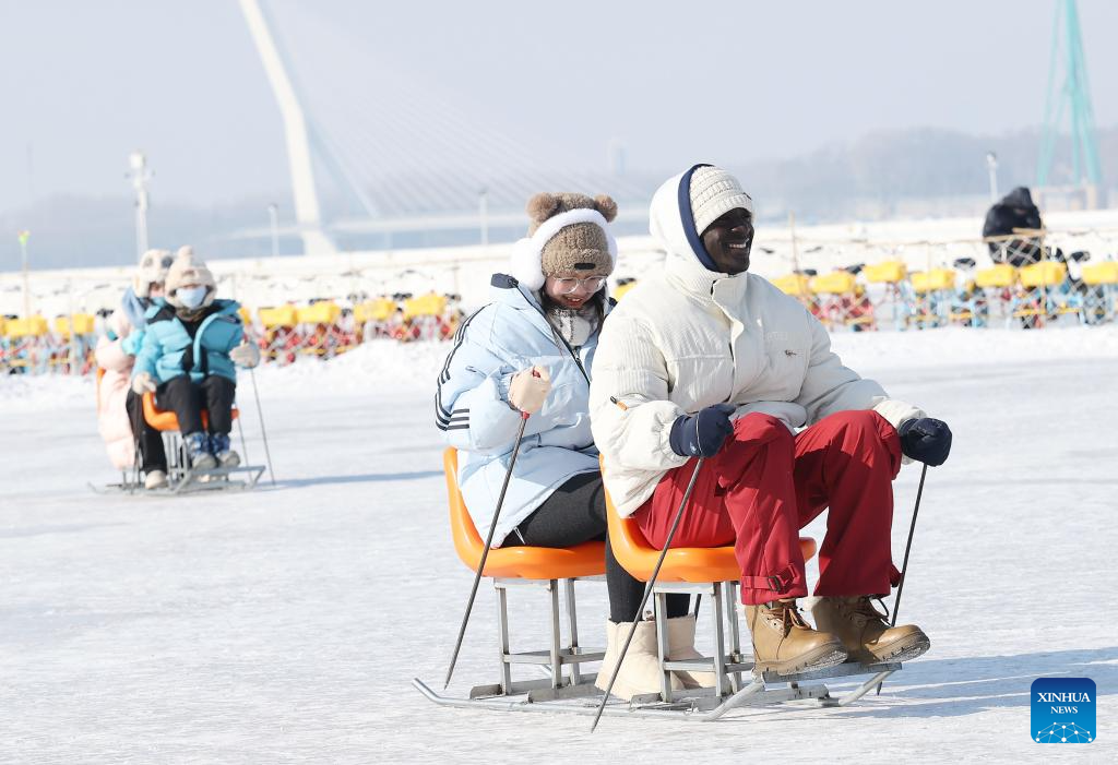 Tourists have fun at the Harbin Songhua River Ice and Snow Carnival in Harbin, northeast China's Heilongjiang Province, Feb. 9, 2025. With the 9th Asian Winter Games underway, Harbin is attracting numerous domestic and international visitors to enjoy the beauty of winter scenery. (Xinhua/Hou Jun)