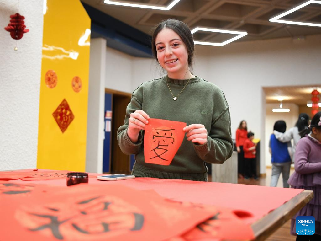 A student tries Chinese calligraphy writing during a Spring Festival Gala to celebrate the Chinese New Year at Geneva Chinese School in Geneva, Switzerland, Feb. 9, 2025. Geneva Chinese School held a Spring Festival Gala on Sunday to celebrate the Chinese New Year, with over 20 performances staged by students and their teachers and parents. The event aimed to celebrate the Spring Festival, promote Chinese culture, and showcase the students' achievements in learning the Chinese language. (Xinhua/Lian Yi)