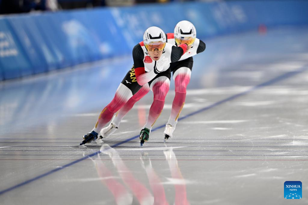 Team Japan compete during the men's team sprint final match of the speed skating event at the 9th Asian Winter Games in Harbin, northeast China's Heilongjiang Province, Feb. 10, 2025. (Xinhua/Huang Bohan)