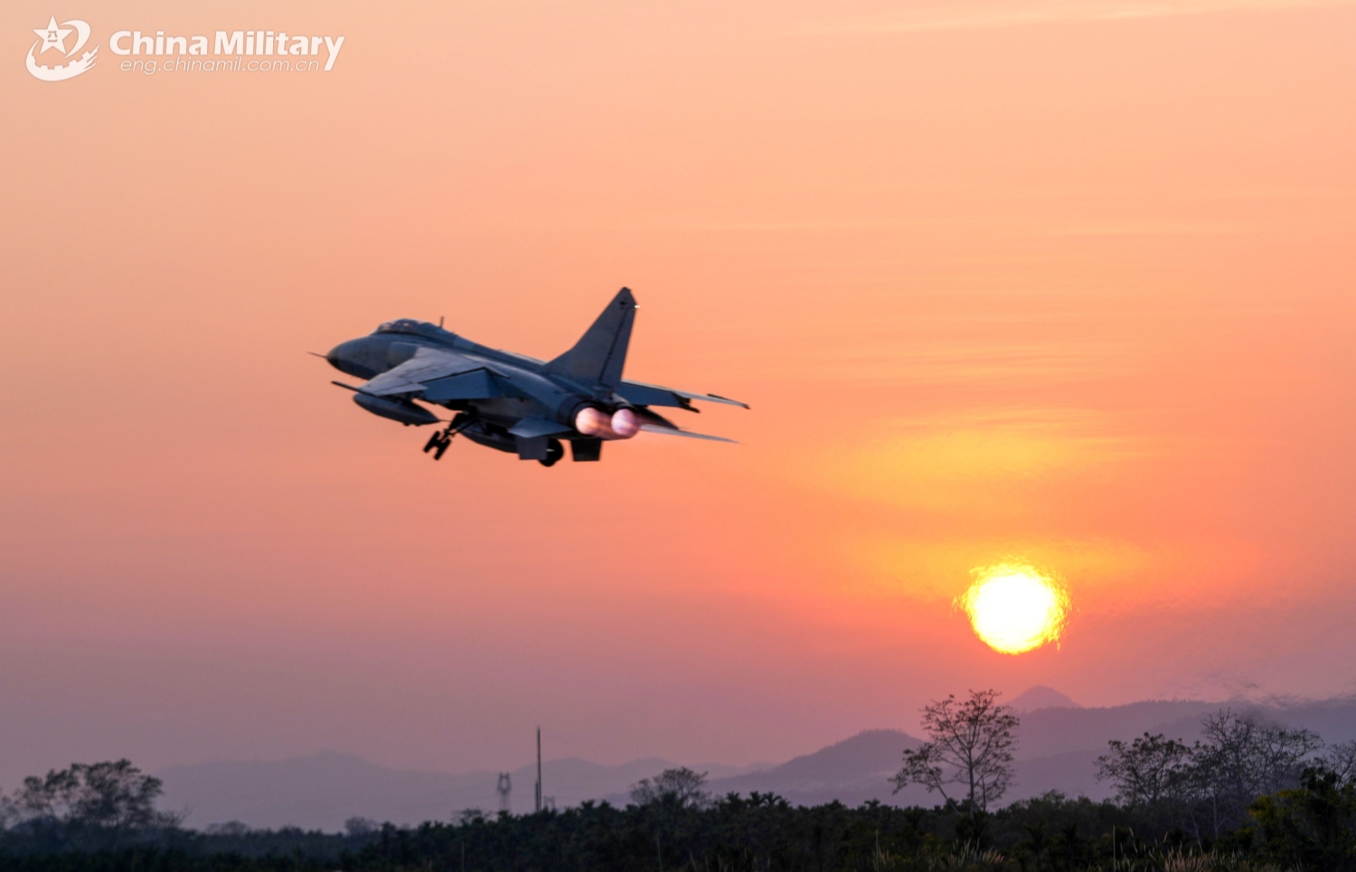 A JH-7 fighter jet attached to an aviation brigade with the air force under the Chinese PLA Southern Theater Command takes off for a round-the-clock flight training exercise on January 21, 2025. (eng.chinamil.com.cn/Photo by Jiang Guangzhen)