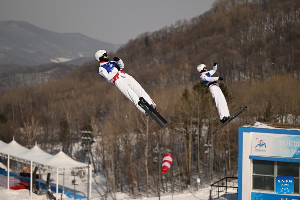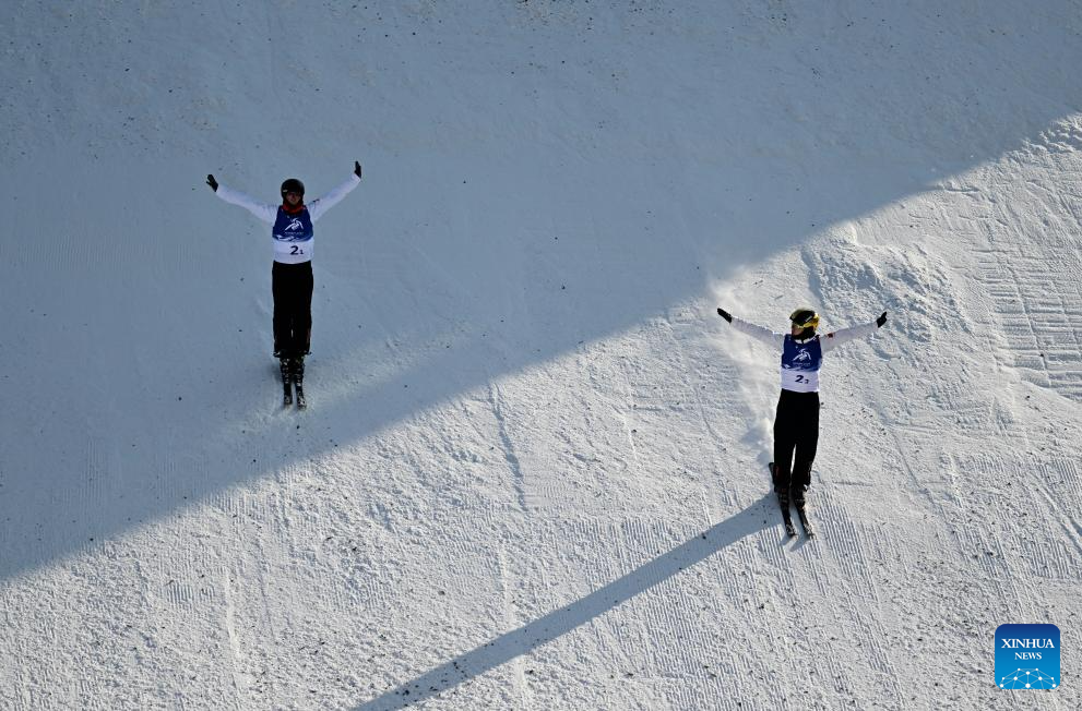 Geng Hu (R)/Yang Yuheng of China compete during the Freestyle Skiing men's aerials synchro final at the 9th Asian Winter Games in Yabuli, northeast China's Heilongjiang Province, Feb. 11, 2025. (Xinhua/Yang Chenguang)