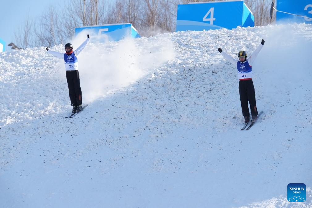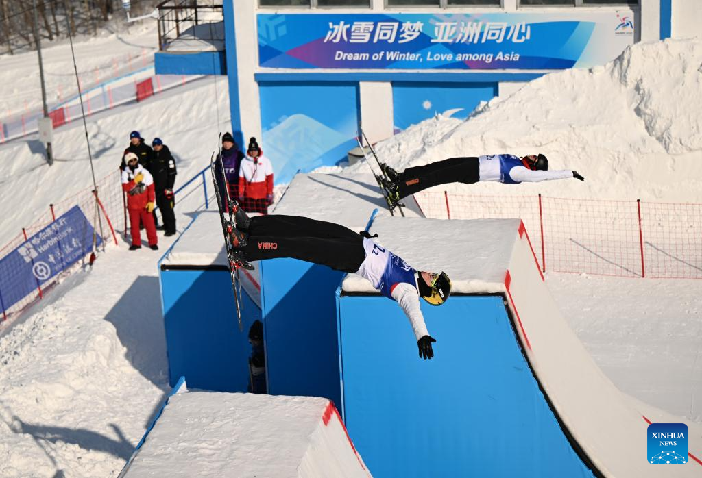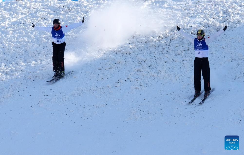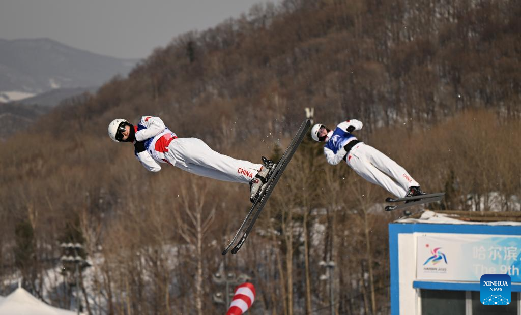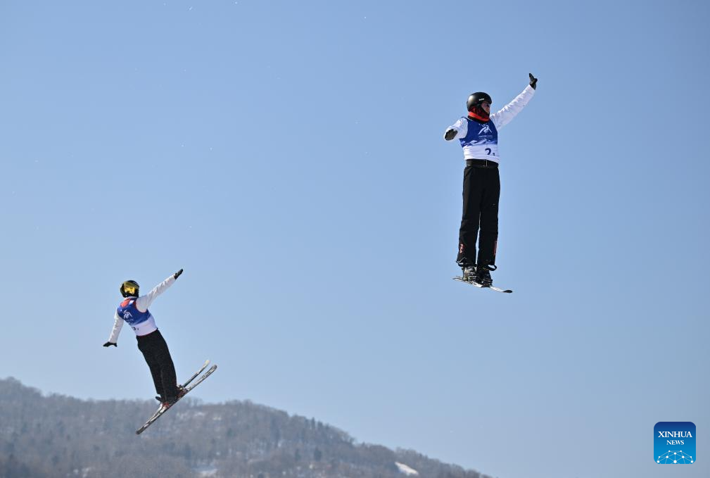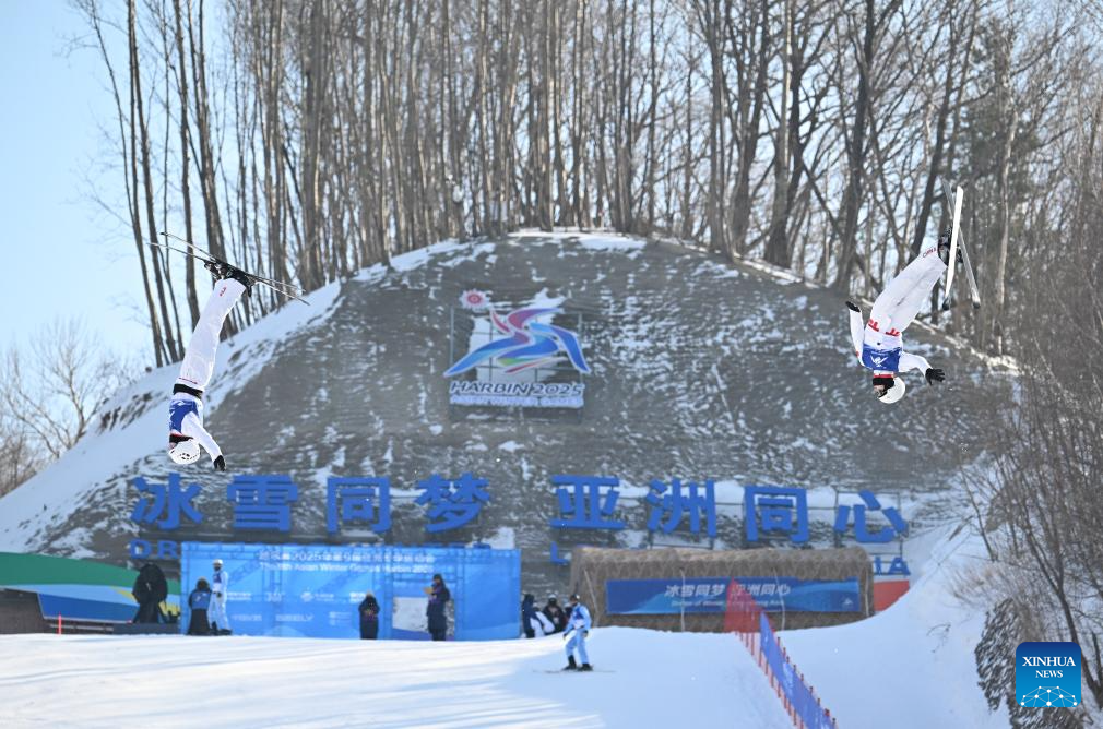 Li Xinpeng (L)/Qi Guangpu of China compete during the Freestyle Skiing men's aerials synchro final at the 9th Asian Winter Games in Yabuli, northeast China's Heilongjiang Province, Feb. 11, 2025. (Xinhua/Zhang Chenlin)