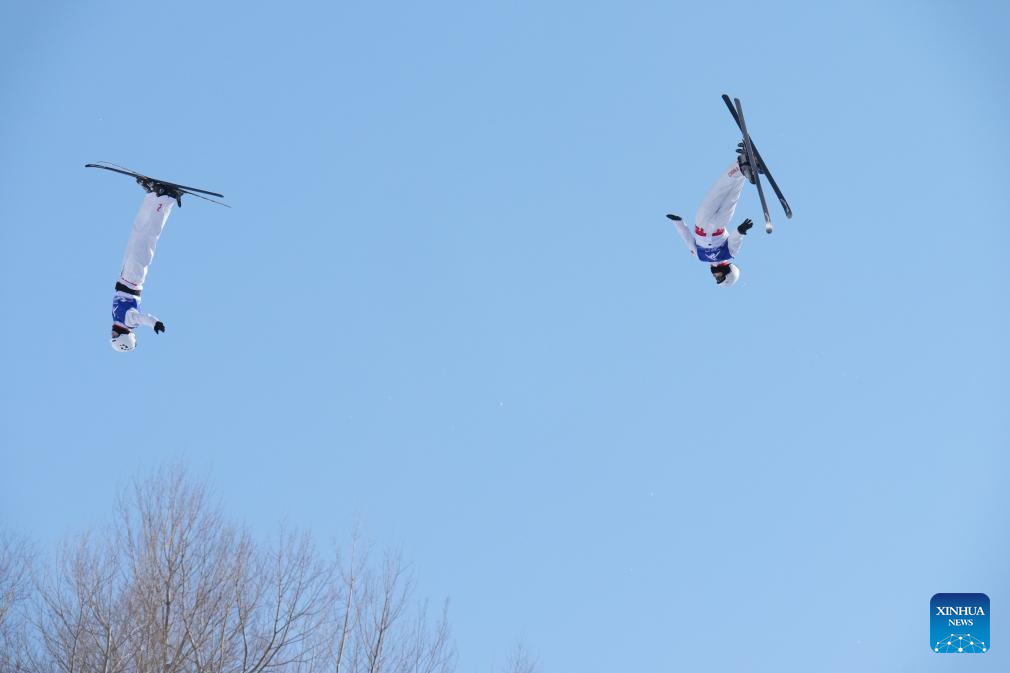 Li Xinpeng (top)/Qi Guangpu of China compete during the Freestyle Skiing men's aerials synchro final at the 9th Asian Winter Games in Yabuli, northeast China's Heilongjiang Province, Feb. 11, 2025. (Xinhua/Xia Yifang)
