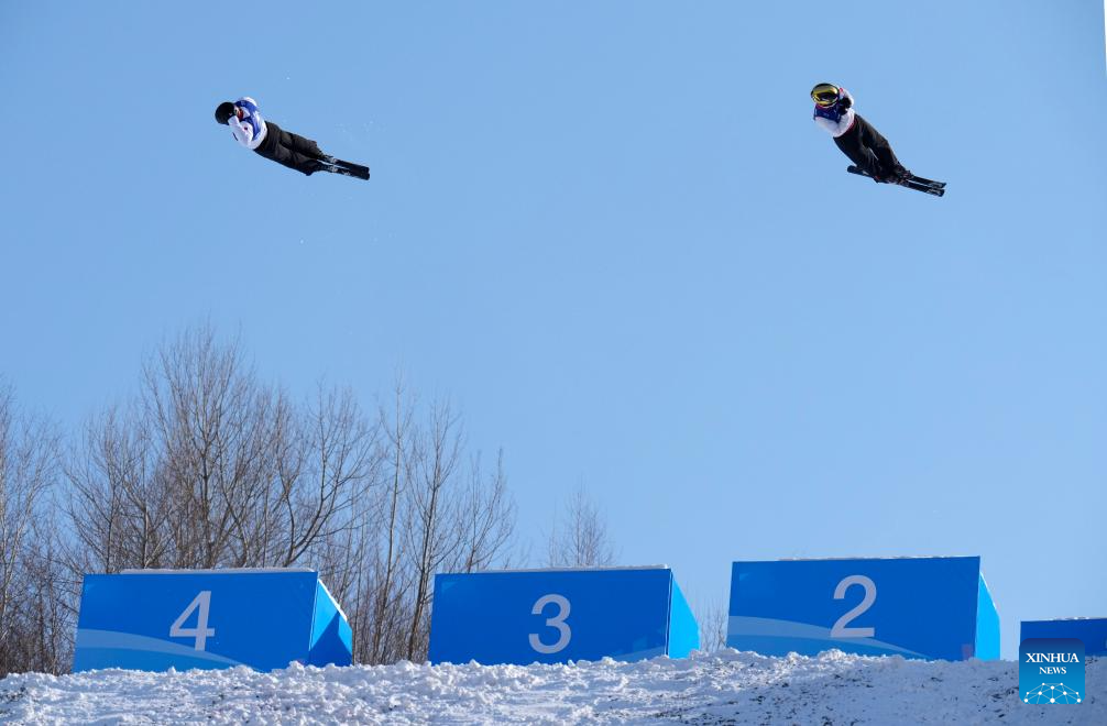 Li Xinpeng (L)/Qi Guangpu of China compete during the Freestyle Skiing men's aerials synchro final at the 9th Asian Winter Games in Yabuli, northeast China's Heilongjiang Province, Feb. 11, 2025. (Xinhua/Wang Song)