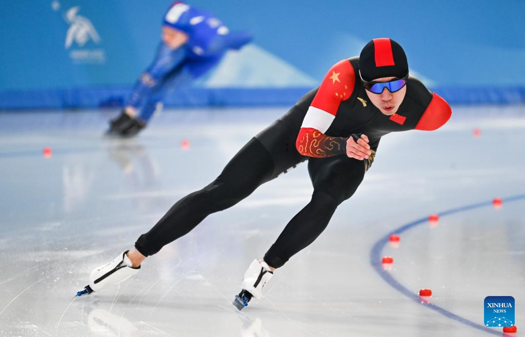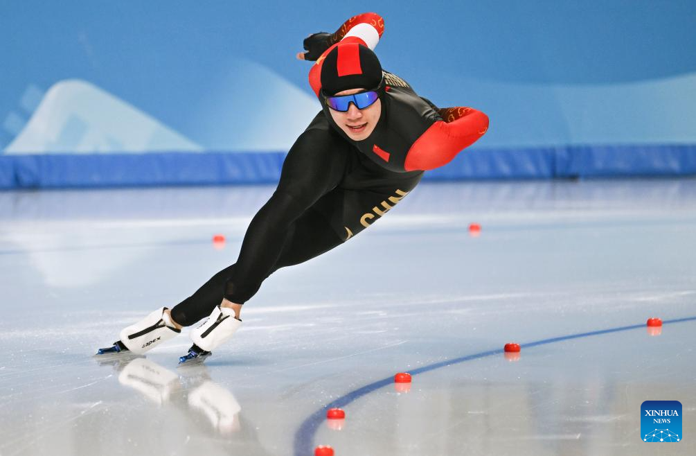 Lian Ziwen of China competes during the men's 1000m final match of the speed skating event at the 9th Asian Winter Games in Harbin, northeast China's Heilongjiang Province, Feb. 11, 2025. (Xinhua/Wang Kaiyan)
