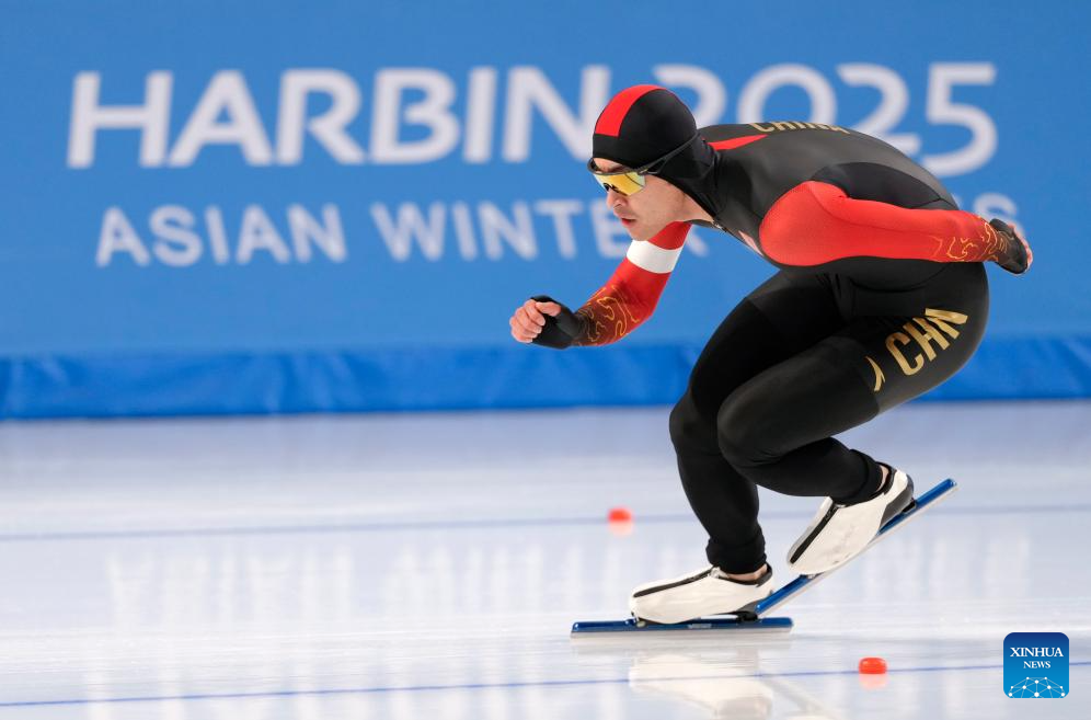 Lian Ziwen of China competes during the men's 1000m final match of the speed skating event at the 9th Asian Winter Games in Harbin, northeast China's Heilongjiang Province, Feb. 11, 2025. (Xinhua/Li Yibo)