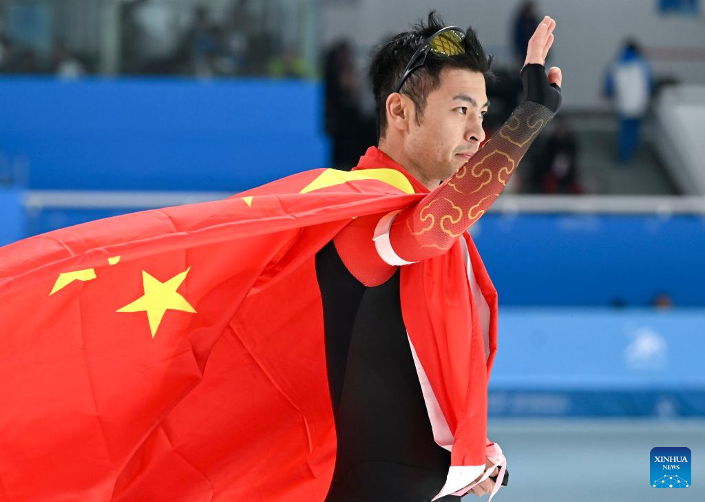 Ning Zhongyan of China celebrates during the men's 1000m final match of the speed skating event at the 9th Asian Winter Games in Harbin, northeast China's Heilongjiang Province, Feb. 11, 2025. (Xinhua/Chen Zhenhai)