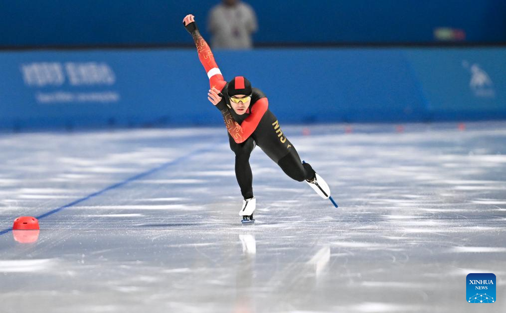 Ning Zhongyan of China competes during the men's 1000m final match of the speed skating event at the 9th Asian Winter Games in Harbin, northeast China's Heilongjiang Province, Feb. 11, 2025. (Xinhua/Wang Jianwei)