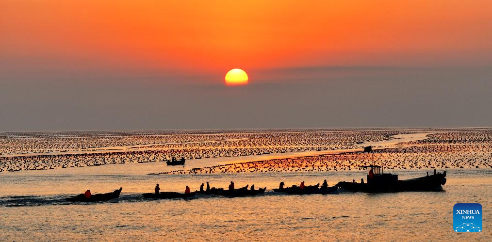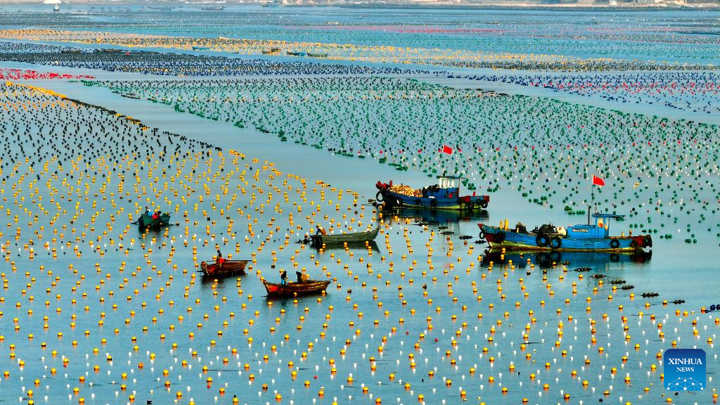 An aerial drone photo taken on Feb. 11, 2025 shows fishermen working at the kelp breeding area in Rongcheng City, east China's Shandong Province. (Photo by Yang Zhili/Xinhua)