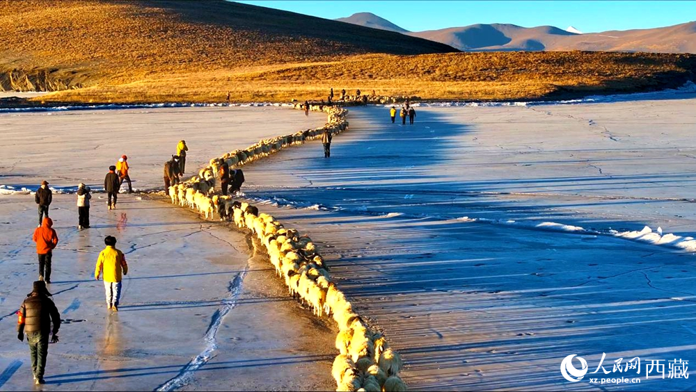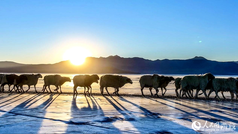 As the first rays of sunlight hit Puma Yumco Lake, located at an altitude of over 5,000 meters in Nagarze county of Shannan, southwest China's Xizang Autonomous Region, the ice-covered surface sparkled like a sapphire. A millennia-old tradition—sheep herding on ice—took place.