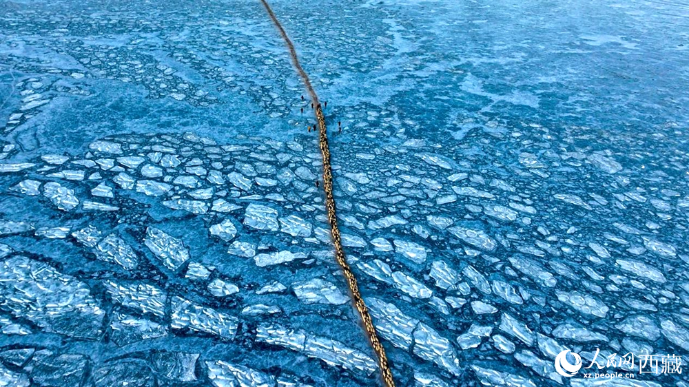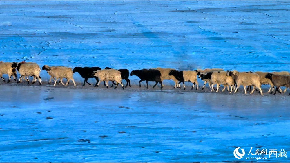 The herdsmen were all set and ready to go. Wrapped in their thick robes, they guided their flock of sheep onto the icy lake. From a distance, the sheep, resembling black and white pearls, slowly moved on the azure ice, painting a breathtaking picture on the vast plateau.