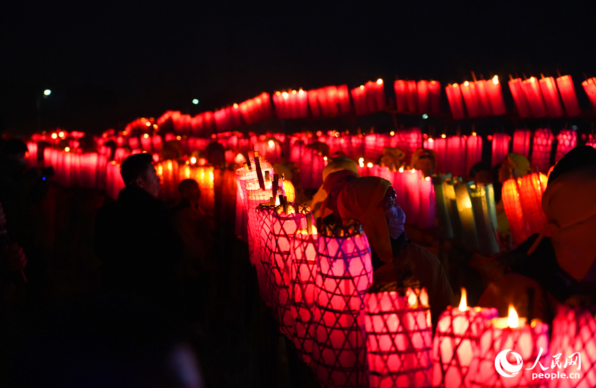 Hu Tao lights up lanterns with a candle before a lantern show kicks off in Tuanbei village, Anyi county, Nanchang city, east China's Jiangxi Province. (People's Daily Online/Mao Siyuan)