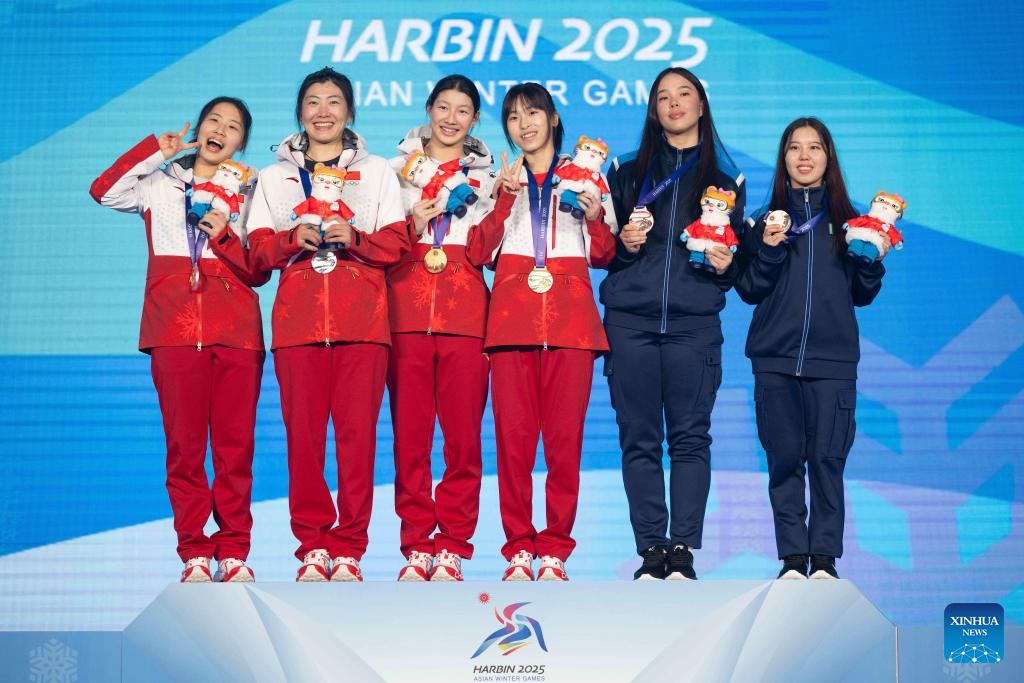 Gold medalists of team China (C), silver medalists of team China (L) and bronze medalists of team Kazakhstan pose during the awarding ceremony for the freestyle skiing women's aerials synchro final at the 9th Asian Winter Games in Yabuli, northeast China's Heilongjiang Province, Feb. 11, 2025. (Xinhua/Xie Jianfei)