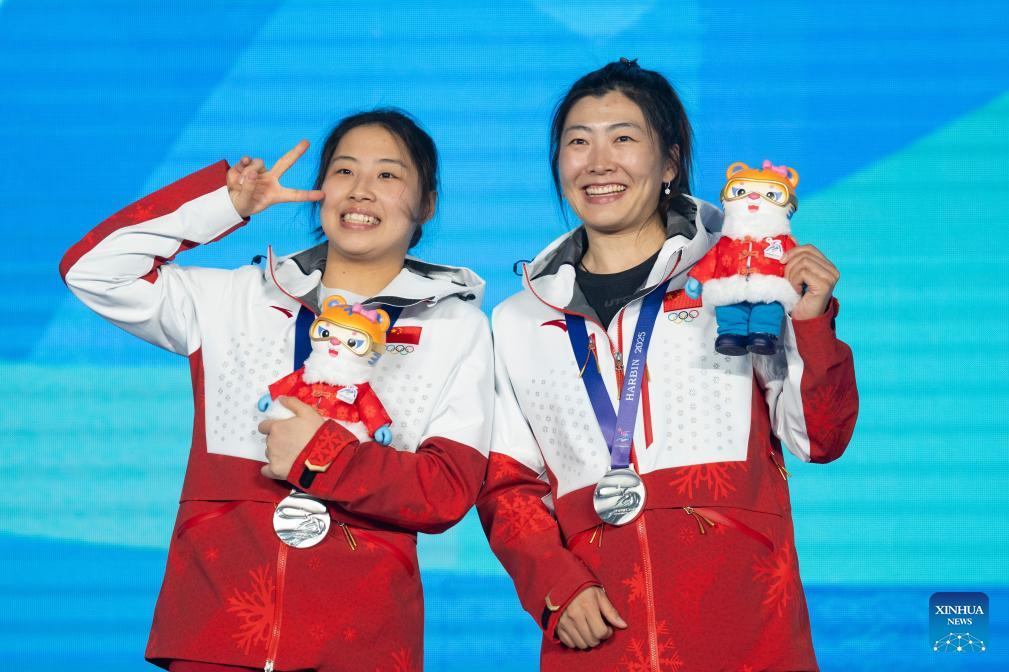 Silver medalists Chen Meiting (L)/Xu Mengtao of China pose during the awarding ceremony for the freestyle skiing women's aerials synchro final at the 9th Asian Winter Games in Yabuli, northeast China's Heilongjiang Province, Feb. 11, 2025. (Xinhua/Xie Jianfei)