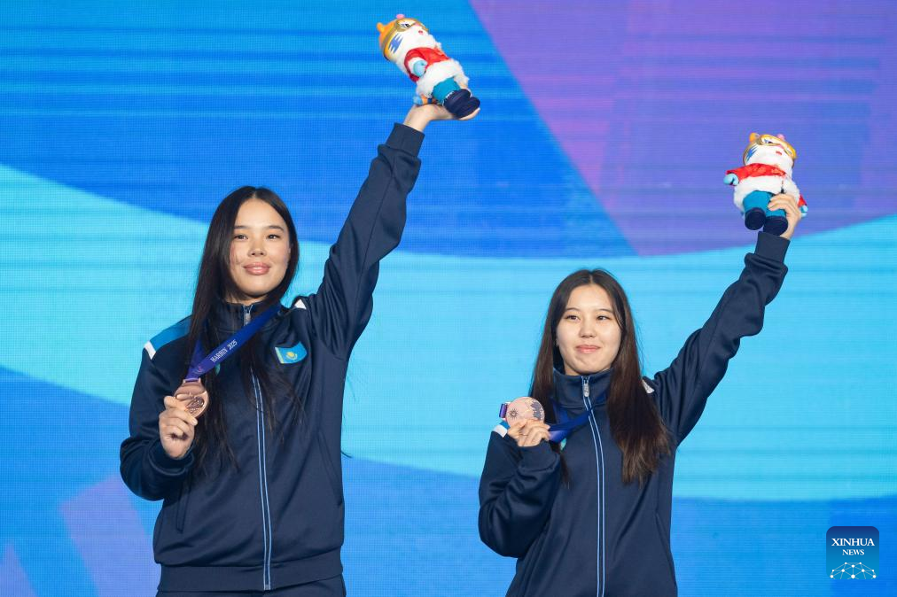Bronze medalists Ardana Makhanova (L)/Ayana Zholdas of Kazakhstan react during the awarding ceremony for the freestyle skiing women's aerials synchro final at the 9th Asian Winter Games in Yabuli, northeast China's Heilongjiang Province, Feb. 11, 2025. (Xinhua/Xie Jianfei)