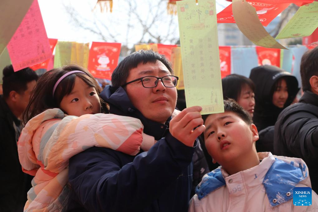 A parent and children guess lantern riddles in Gaomi City, east China's Shandong Province, Feb. 12, 2025. Various activities were held across China to celebrate the Lantern Festival, which falls on the fifteenth day of the first month of the Chinese lunar calendar. (Photo by Li Haitao/Xinhua)