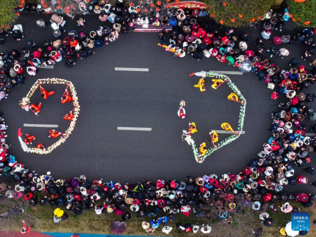 An aerial drone photo taken on Feb. 12, 2025 shows people watching a dragon dance in Luxian County, southwest China's Sichuan Province. Various activities were held across China to celebrate the Lantern Festival, which falls on the fifteenth day of the first month of the Chinese lunar calendar. (Photo by He Haiyang/Xinhua)