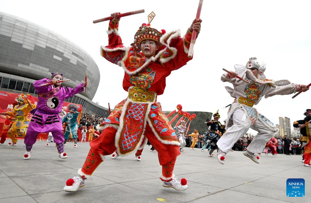 Folk artists perform a Yingge dance at a folk performance show celebrating the Lantern Festival in Handan City, north China's Hebei Province, Feb. 12, 2025. Various activities were held across China to celebrate the Lantern Festival, which falls on the fifteenth day of the first month of the Chinese lunar calendar. (Photo by Hao Qunying/Xinhua)